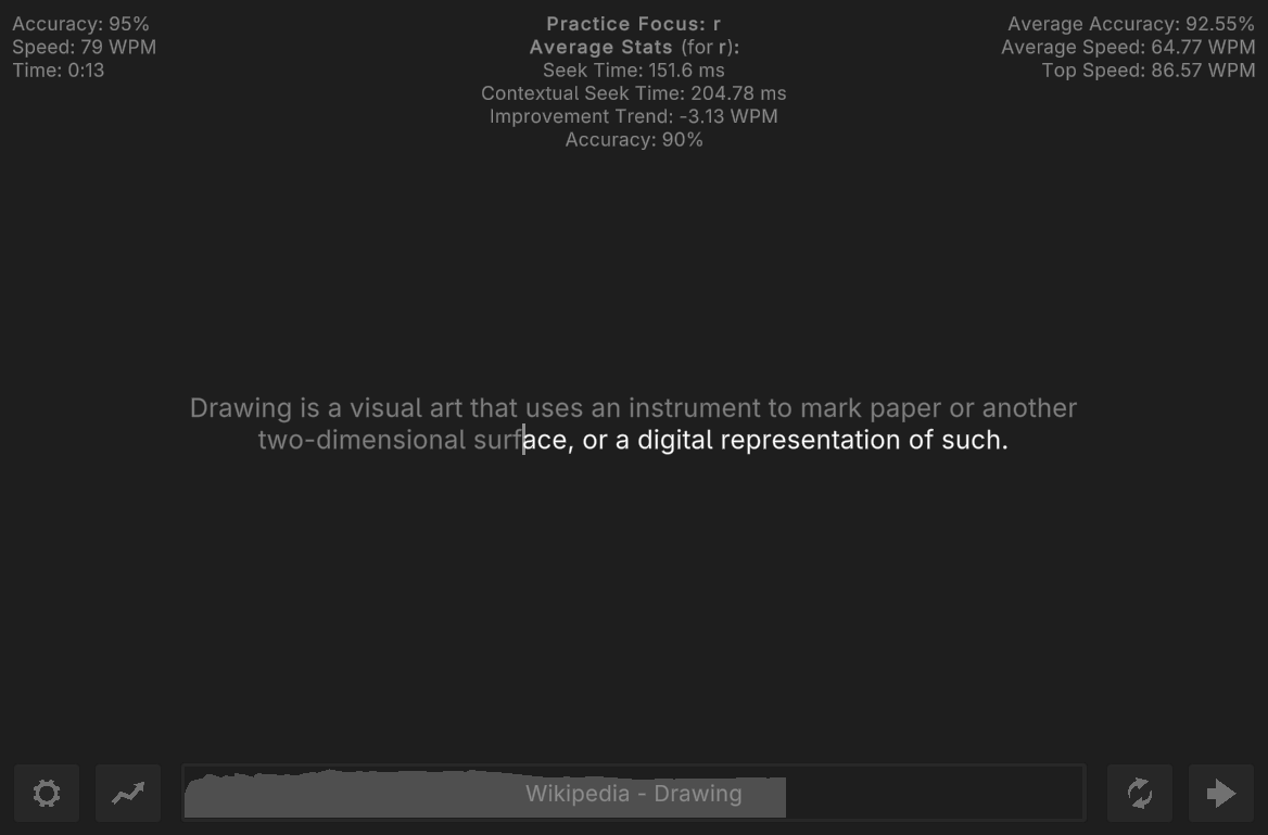 - Speed - Average words-per-minute over the current practice, shown in the grey filled area