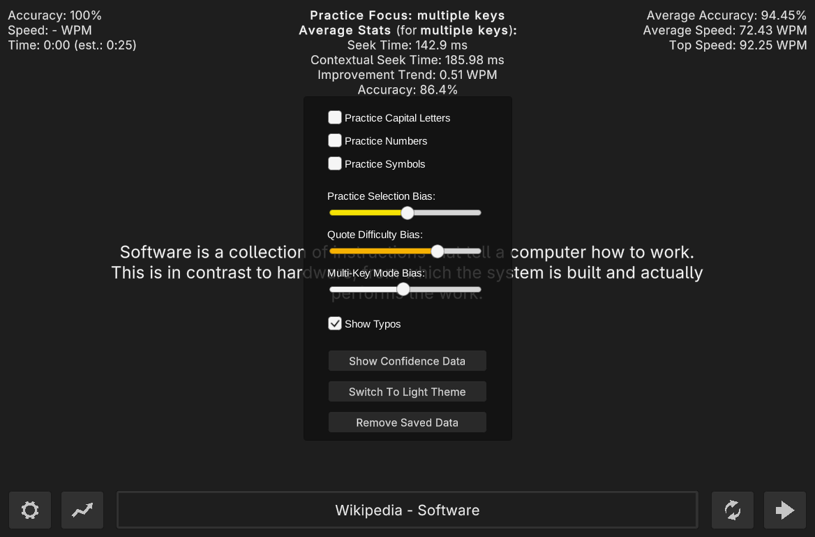 The program measures your typing skill as you type (more on this below), and uses this information to help promote improvement and consistency in your typing. Keyflow chooses the practice and text by prioritizing letter frequencies of keys with lowest skill and highest improvement.