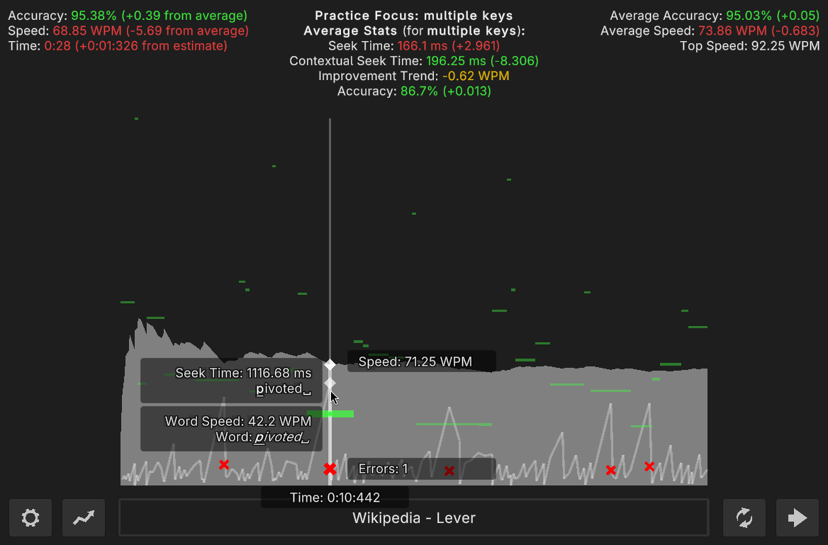 Upon completing the text, a graph summarizing your performance appears over the text (where X is time and Y is value), helping you see how you performed over the course of the practice. Using the graph, you can better understand what slows you down or makes you faster.