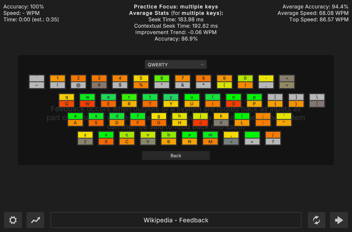 A visual representation of stored confidence data can be accessed via settings. The key confidence map displays an on-screen keyboard, where each letter is colored based on your typing confidence (skill) for that particular key. The keys which tend to slow you down will be colored orange or red, while the keys with high confidence will appear green.